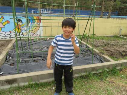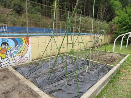 今日の理科では,ツルレイシを育てるためのネット作りと,マルチをはりました。