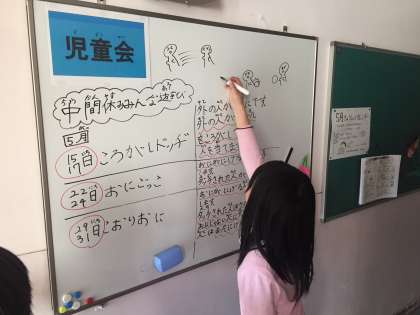 毎週火・木の中間休みをみんな遊びとして,全校児童で遊んでいます。児童会の子たちはみんなが楽しめる内容を考えています。児童会の掲示板にわかりやすいように頑張って書いていました。