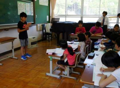 今日の発表は、3年生と5年生の2人でした。3年生は今、夢中になっているスケボーについて、5年生は好きな和太鼓についてでした。2人とも実演を取り入れ、堂々とした発表ができました。