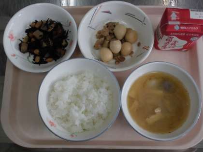 ごはん 牛乳 鶏肉のさっぱり煮 五目ひじき いものこ汁