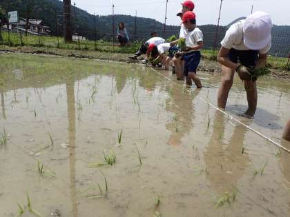 今年は自分たちで育てた苗も田植えをできるほどに育ったので,一緒に植えました。