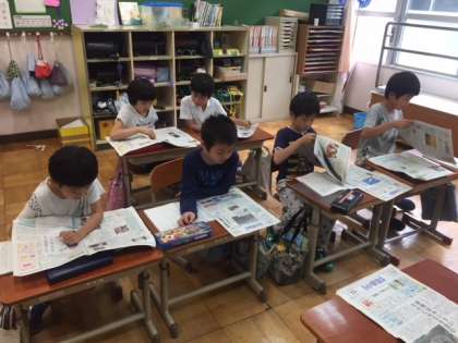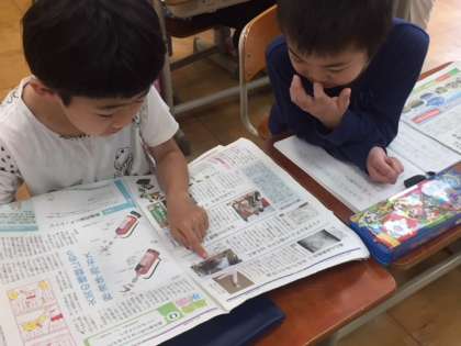 よい聞き手になろうの単元で,話したい内容を子ども新聞から探しています。新聞の中にはたくさんの記事や写真があるので,子どもたちはどれについて話そうか楽しく選んでいました。