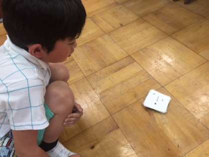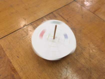 算数の時間ではこまを作って実際に回してみました。こまがどんな形をしていても,点はまるい形をえがいていくことを楽しんで発見していました。何個も作ったり友達と見比べたりできました。