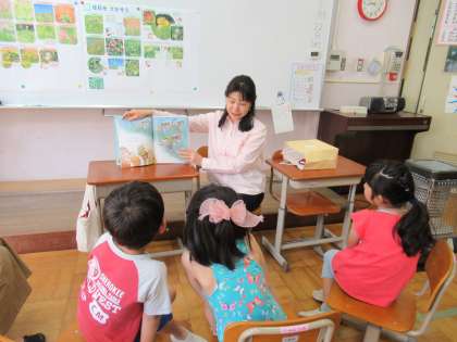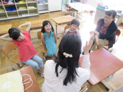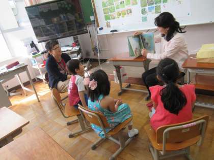 第1回目は,1年生です。梅雨入り前のこの時期に,雨やどりのお話を聞かせてもらいました。色々な動物が出てくるスケールの大きな,楽しいお話でした。