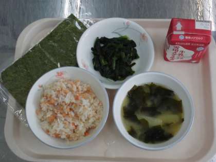 ごはん 牛乳 セルフおにぎり(具・梅さけ) ほうれん草のおかか煮 みそ汁