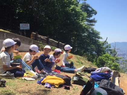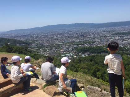京都市の様子を見に行くために大文字山へ行きました。前日の雨で心配していましたが,今日は見事な快晴で,南の方は大阪のビル群まで見えていました。絵地図で見ていた様々な場所もたくさん発見できました。