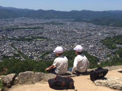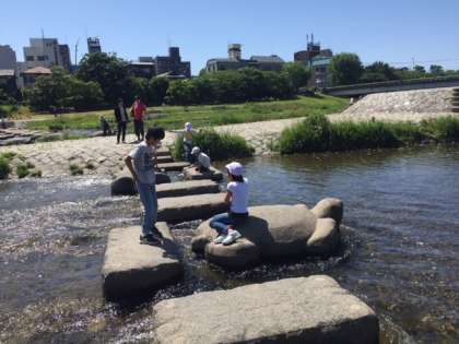 バスを待っている時間に出町柳の亀石のところに行きました。2本の川が合流している様子もしっかりと見学することができました。