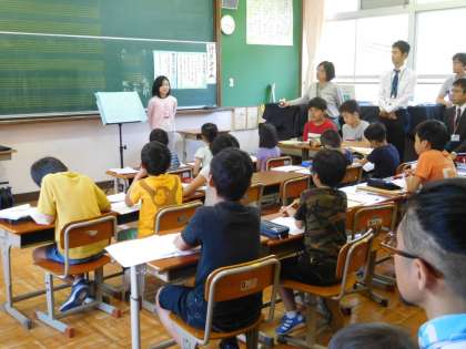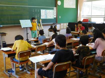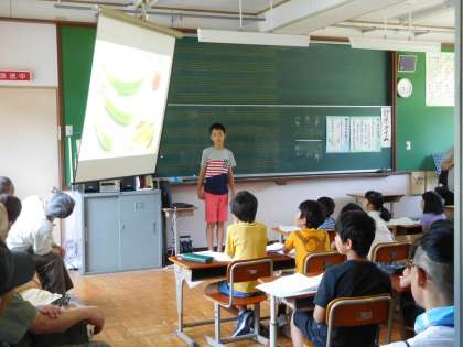今回は、3人の子どもたちが発表しました。3年生は好きな冬のスポーツ(スキー)のこと、5年生は習い事(水泳)のこと、6年生は野菜作りのことを話しました。