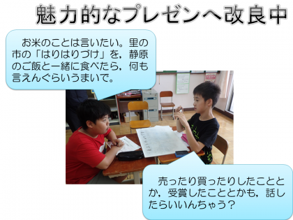 トレードフェアを通して静原をいきいきさせるためのプランを6年生が考えています。そのプランを,まずは,校長先生に聞いてもらいました。