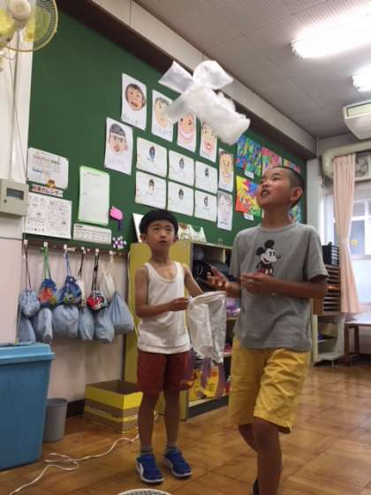図工の時間に送風機を使ってふわふわとうかぶ作品を作りました。送風機の風を上手に受けると天井付近まで上がっていくのを楽しんでいました。おばけや飛行機などいろいろなものが宙に舞っていました。上手く浮かんだあとは飾り付けをして仕上げました。