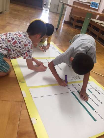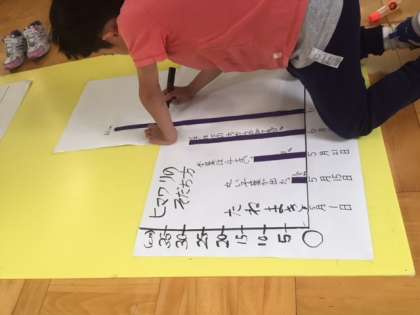 理科で育てている植物の成長を紙テープで表しています。ぐんぐん成長してきて,成長の様子にちがいが出てきて面白いです。ヒマワリは1週間で一気に3センチほど伸びていました。