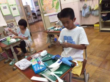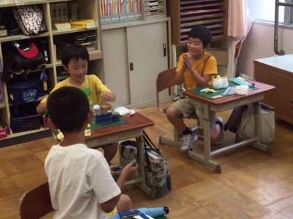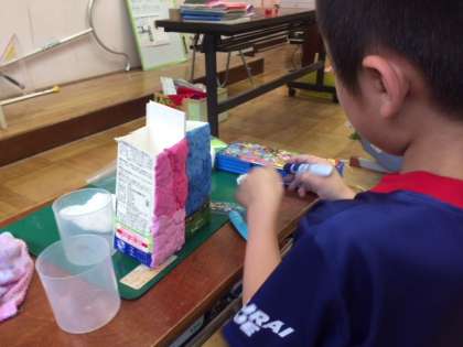 紙粘土に色を付けた色粘土を使って作品を作っています。身の回りのヨーグルトカップやお菓子のケースなどを心材にして使いやすいものを選びました。手を絵の具だらけにしながら,楽しそうに作っています。
