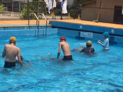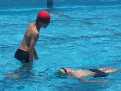 プールでは安全確保につながる運動も取り入れています。体をバディにしずめてもらって浮かび上がる方法や,背浮きで浮く活動にとりくみました。お互いにアドバイスをしながら頑張れました。