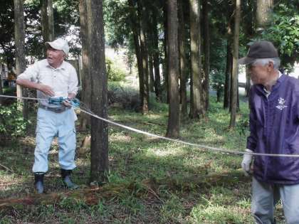 みんなで協力して,木を倒す方向に気を付けて力いっぱい引っ張りました。
