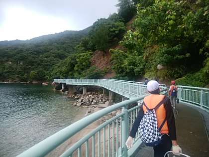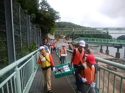 今日の活動のメインは野外炊事です。海の見える炊事場に向けて道具や材料を持って出発です。