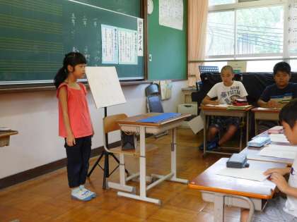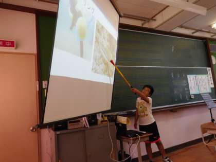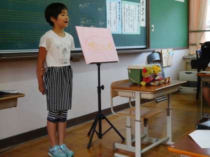 今回は、3人の子どもたちが発表をしました。1年生は好きな工作のこと、3年生は妹のこと、5年生は長期宿泊学習で学んだことを話しました。