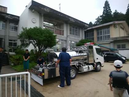電気が復旧して、日常生活が戻ってくるかと思いきや、今日は断水です。静原地域は静原浄水場で地下水を取り入れ、水道として使っています。住宅地の停電はいち早く直していただきましたが、浄水場のある山は倒木のため停電が続いています。そのため、ポンプや機械が動かず、水道水の供給ができなくなってしまったのです。今日は給水車に来ていただき、その水で、給食を実施することができました。水道はじめ、倒木など、まだまだ台風の影響は続いています。