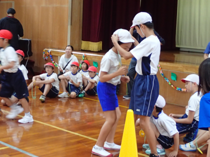 徒競走では,静原小のみんなで作ったメダルをプレゼントして,