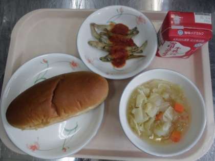 黒糖コッペパン 牛乳 わかさぎのからあげトマトソースぞえ 野菜のスープ煮