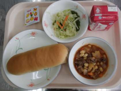 コッペパン(国内産小麦100%) 牛乳 大豆と牛肉のトマト煮 アスパラガスのソテー チーズ