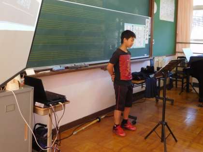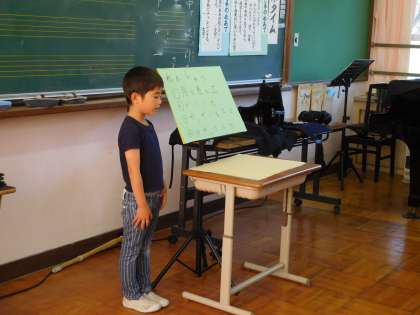 今回は、1年生と4年生、そして、先生が発表しました。1年生は習い事の剣道のこと、4年生は広島の原爆のこと、先生は先生になった理由について話しました。