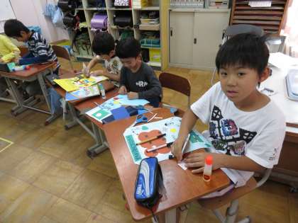 カード作りの続きを行いました。半分ほどの児童は出来上がり,英語でカードの紹介の練習もできました。