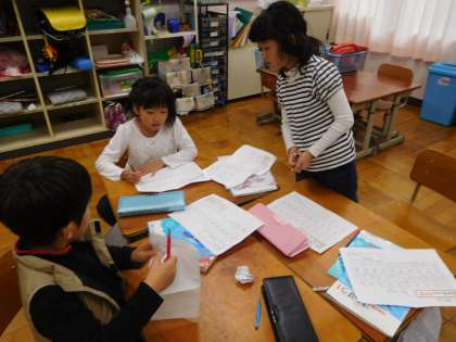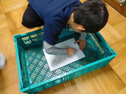 こすり出しをして、クイズにしました。いろいろな先生や上の学年の友達に解いてもらって、1年生は大喜びでした。休み時間に集まって、答え合わせに熱中。