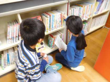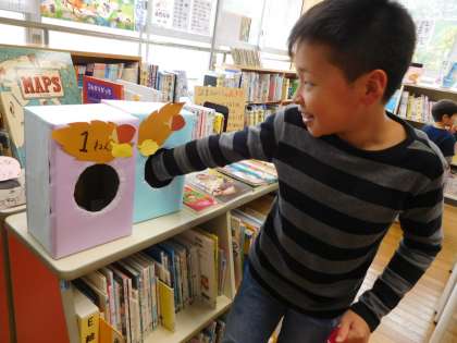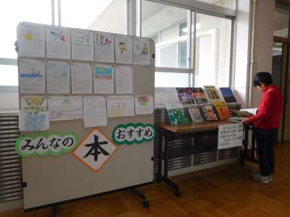 子どもたちがかいた「おすすめの本の紹介」が図書館前に掲示してあったり、図書館内に「読書おみくじ」の箱があったりします。今日の昼休みには、図書委員会主催の「図書館シールラリー」もありました。