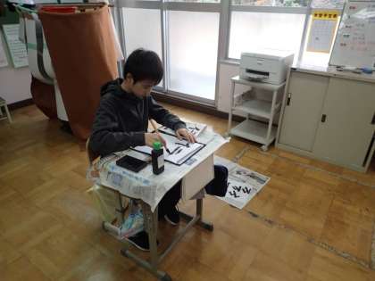書写の時間に毛筆で「伝統」と書く清書をしました。