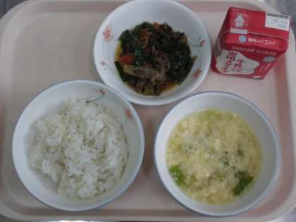 麦ごはん 牛乳 プルコギ レタスと卵のスープ