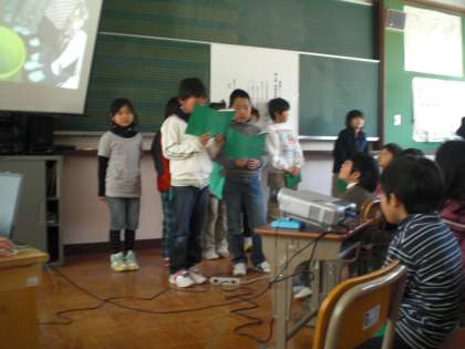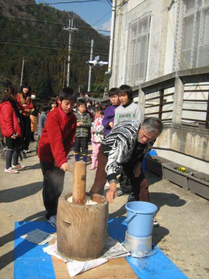 2月3日の木曜日に教育ファームの交流会がありました。教育ファームの取組に参加した学校やお世話になった地域の方にたくさん参加してもいたいところではあったのですが,各校の都合により鞍馬小学校のみの参加となりました。まず,もちつきや昼食交流会を行い場を和やかのものとしました。つきたてのおもちをきなこもちとしていただきました。中には,10個も食べた子どももいました。第二部として,発表交流会を行いました。静原小学校3年生の発表をかわきりに,鞍馬小学校の2年生が発表してくれました。そして,この日参加できなかった新洞小学校と府立盲学校よりビデオレターによる交流を行いました。そして,地域の方からもお言葉をいただいて閉会としました。