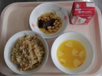 麦ごはん 牛乳 とりそぼろ丼(具) こんぶ豆 オレンジアップルン
