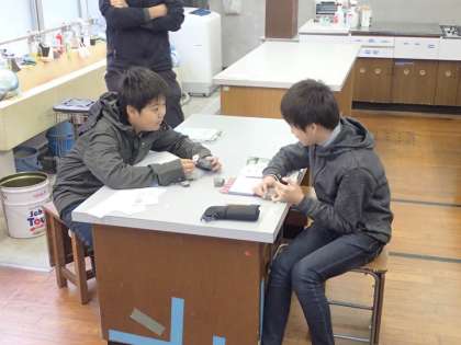 自分で作った粒土表(粒の大きさで泥や砂を見分けるもの)をもとに,