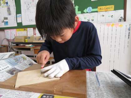 まず,どんな種類の彫刻刀があり,どんな用途で使うのかということを指導し,実際に使いながら怪我をしないために気を付けなければならないことを指導していきました。