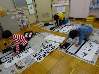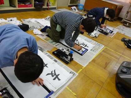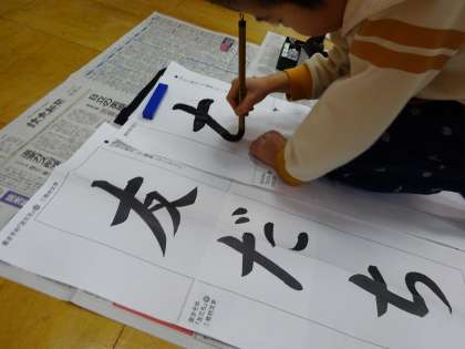 書き初めで「友だち」という字を書きました。初めて画仙紙に書いたり,床で書いたりしたのでバランスを取るのが難しそうでした。書き初め展で展示するので楽しみにしておいてください。