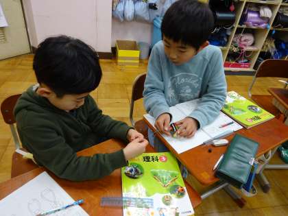 今日はソケットを使わずに豆電球にあかりをつけることにチャレンジ。予想では一人しか出なかったつけ方で見事について「お〜」と歓声があがりました。ソケットのどう線の付き方をよく見ていたそうです。細かいところまでよく観察していました。
