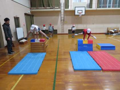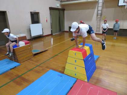 とびばこは今日が初めてで,たてと横の開脚跳びを練習しました。