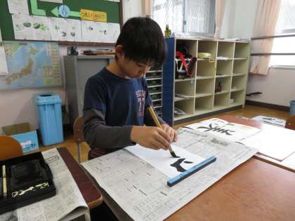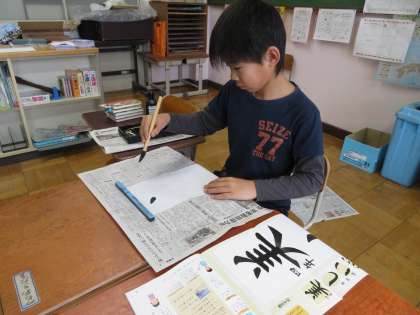 4年生:習字の時間「美しい心」の清書