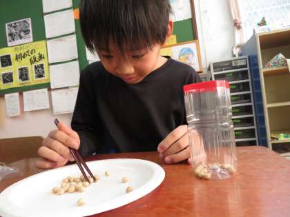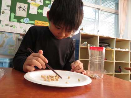 来週から『給食週間』が始まり,その中で豆つまみ大会があるので,その練習をしてみました。本番は1分間?だと思いますが,今日は3分間で練習してみました。(結果は24個でした)