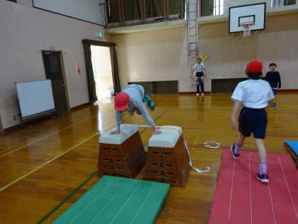 横かかえこみとびを頑張っています。ゴムの場を上手に使って,足をかかえるタイミングや空中での姿勢をくりかえし練習しています。