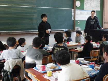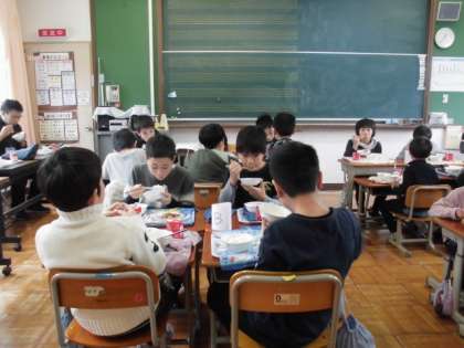 今週は給食週間です。今日は全校での交流給食があり,たてわりグループで給食を食べました。健康委員会の児童による給食週間の説明と「いただきます」の挨拶の後,どのグループも楽しそうに,おいしそうに食べていました。みんな自分の担当の係の仕事をしっかりこなし,テキパキと準備や後片づけもできていました。