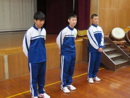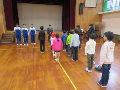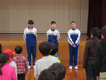 今日から,洛北中より3名の生徒が「生き方探究チャレンジ」として,静原小学校に来ました。その3名と静原小学校の児童が顔を合わせ,お互い挨拶をし合いました。