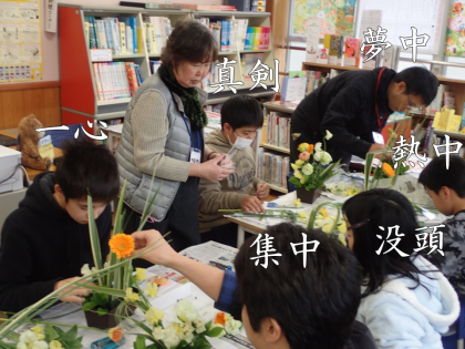 ふんわりとスイートピーの甘い香りがただよう中,作品づくりは進んでいきました。みんな夢中になって取り組んでいたので,時間はあっという間に過ぎていきました。できあがったどの作品も,作者の個性が表れていて,見ていてとても明るい気持ちになります。