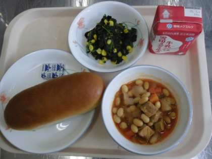 味つけコッペパン 牛乳 ポークビーンズ ほうれん草のソテー チーズ