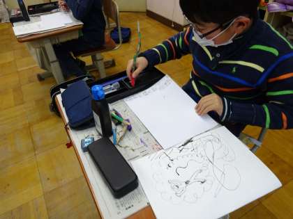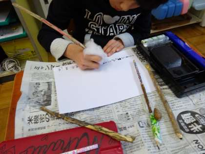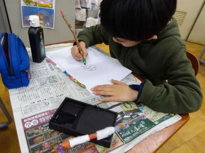 枝を小刀でけずってペンを作りました。墨汁をつけて字や絵をかいてみました。二又の枝を使ってコンパスのように円をかいている子もいました。