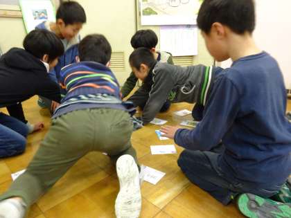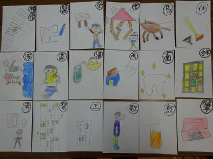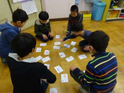 国語の学習で,読み札に同じ漢字の音読みと訓読みを両方使ったかるたを作りました。みんなで作りためたカードを使ってカルタをして楽しみました。
