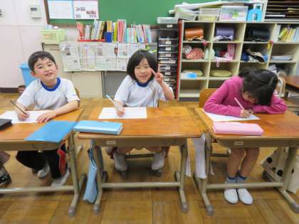 2年生はクラス目標を決めプリントに書いていて,6年生は算数(点対称)の学習をしていました。