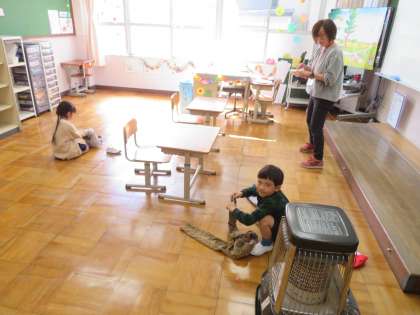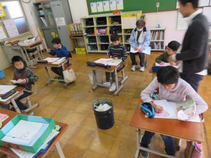 1年生は体育の服装に着替えた後,自分の服をたたみ,4年生は国語の学習をしていました。