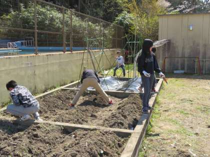 4年生が畑を耕していると,去年のジャガイモがごろごろ出てきました。6年生はそれを種イモにして,ジャガイモを植えました。さあ,芽は出てくるかなあ?