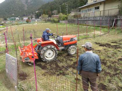 最初はみんなで堆肥をバケツに入れて,田んぼにまきました。そして,機械を入れていただいて田起こしをし,畦道も作っていきました。